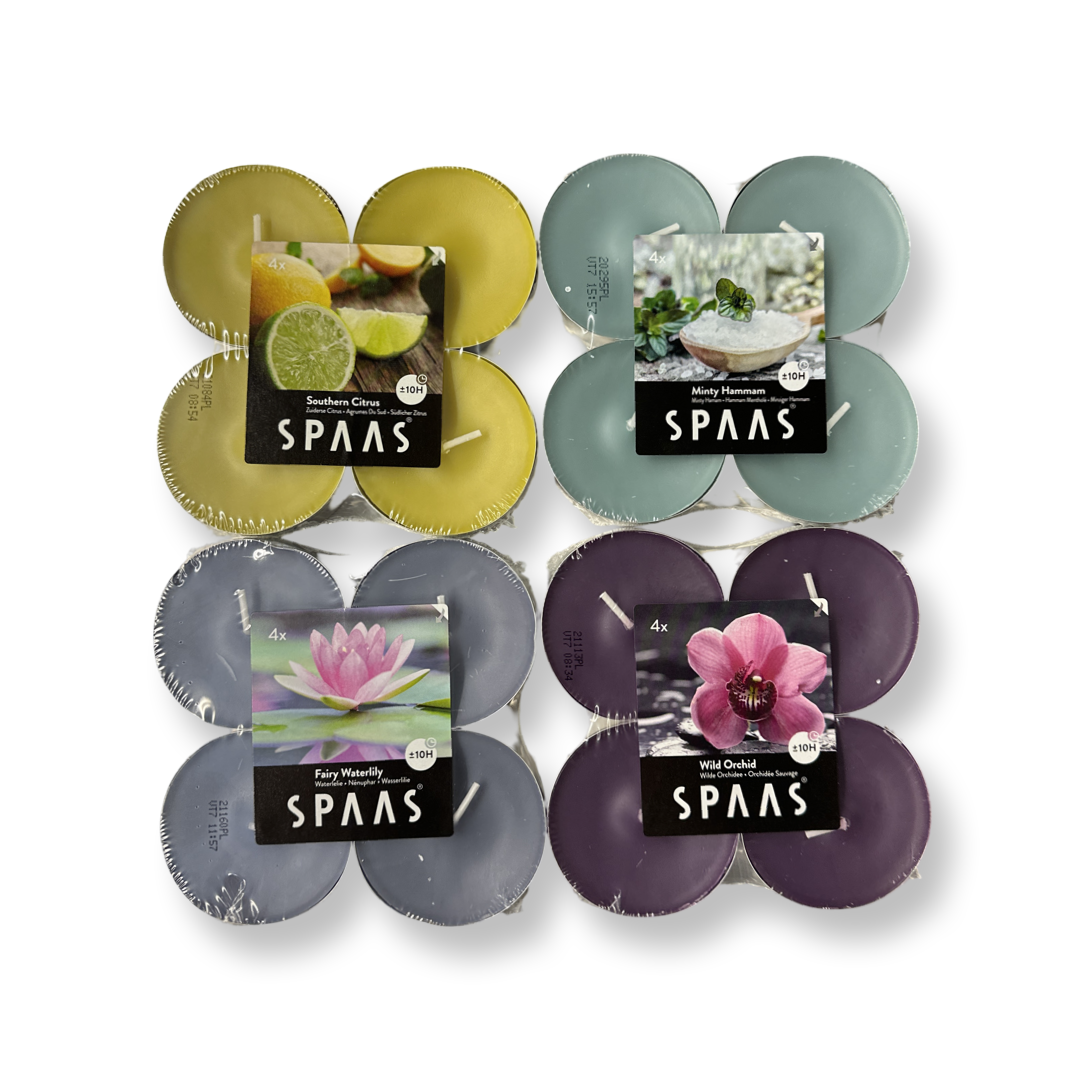 Spaas Geurtheelichtjes/waxinelichtjes Maxi - Assortiment - Sfeerpakket - 16 stuks - 10 branduren - 4x 4 geurkaarsen